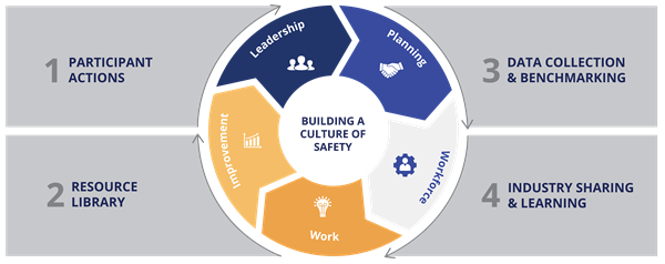 The OSA program is framed around five areas of internal operations. These areas are modelled after a simplified safety management system (SMS) and were chosen to align with participating companies’ systems as well as to provide opportunity for program growth. There are four core components – Participant Actions, Resource Library, Data Collection & Benchmarking and Industry Sharing & Learning – designed to help companies improve their internal operations across these five areas.