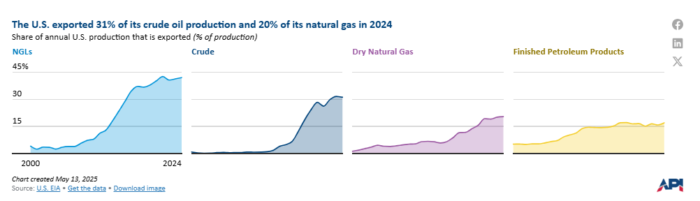 The U.S. exported record levels of crude, natural gas liquids (NGLs), and natural gas in 2024. The share of U.S. oil and natural gas production that is exported has been on the rise over the past decade as domestic production increased. Around 42% of U.S. NGL production is exported, 31% of crude, 20% of natural gas, and 17% of finished petroleum products. In 2024, the U.S. exported crude, NGLs, and finished petroleum products to 101 unique countries or territories.
