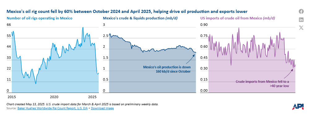 Mexico’s oil production has declined by 160 kb/d (8%) between October 2024 and April 2025, as the number of oil drilling rigs has tumbled by 60%. Mexico’s state-owned oil company, PEMEX, suspended service provider contracts to focus on repaying more than $24 billion in debt to suppliers. There are now just 20 rigs operating in the country, the fewest since 2018. Mexico was the second-largest source of U.S. crude imports in 2024, but in January, flows to the U.S. fell to their lowest level since July 1981.