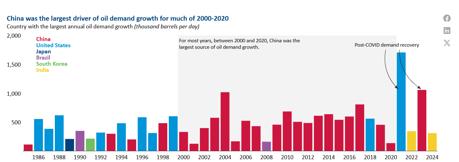 China was the largest contributor to annual global oil demand growth in 20 of the past 25 years. Since 2000, China has accounted for 44% of global oil demand growth, with domestic consumption more than tripling. However, India’s oil demand growth outpaced China’s in both 2022 and 2024. India is expected to become the leading driver of global oil demand growth in the medium term. China’s oil demand growth is expected to slow due to a declining population, rising EV adoption, and a deceleration in economic growth.