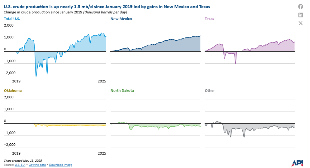 U.S. crude oil production grew by 1.29 million barrels per day (mb/d) between January 2019 and February 2025. This increase was driven by New Mexico and Texas, which together added 2.13 mb/d, more than offsetting declines in other regions. New Mexico now accounts for 16% of total U.S. crude production, up from 7% in January 2019.