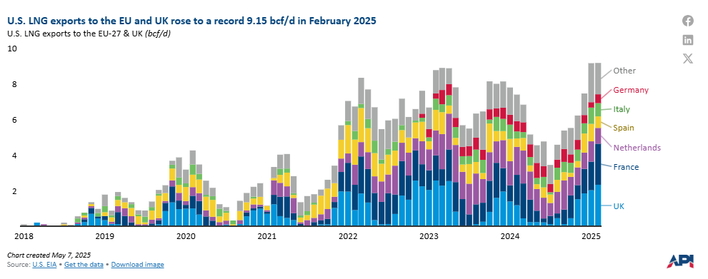 U.S. LNG exports to Europe reached record highs in both January and February 2025. In the first two months of the year, 65% of all U.S. LNG shipments went to the EU or UK, up from an average of 48% in 2024. U.S. LNG flows to Europe could remain elevated as the region rebuilds natural gas inventories ahead of winter and as new U.S. LNG export capacity ramps up. Europe’s natural gas inventories ended the winter at 33% full, significantly lower than in the past two winters, when inventories were more than 55% full.