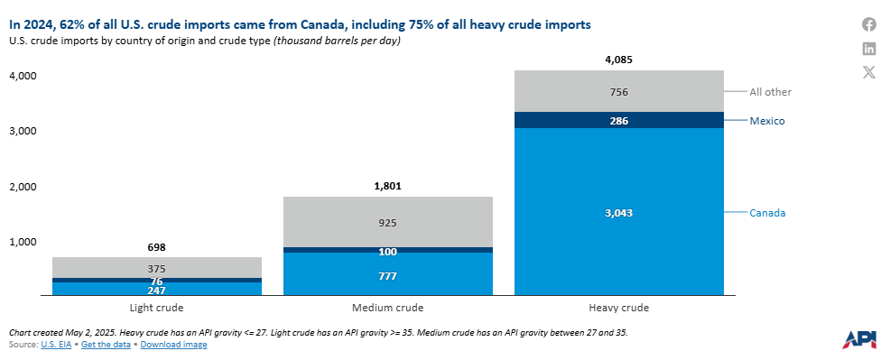 The U.S. imported 6.6 million barrels per day (mb/d) of crude oil in 2024. Canada was the largest source, accounting for 62% of total imports, followed by Mexico at 7%. Over 60% of U.S. crude imports are classified as heavy crude, with a ≤27 API gravity (a measure of density). In contrast, around 80% of U.S. lower 48 crude production is light crude, with an API gravity above 35. The U.S. imports heavier crudes to help meet domestic refining needs.